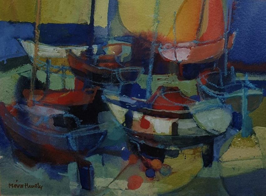Moira Huntley (20th Century) Watercolour "Floats",  Boats in harbour, signed lower left, 15cm x 19.5cm
