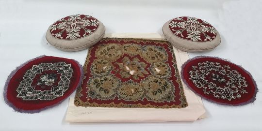 Pair of Berlin woolwork panels on circular grey silk cushions, pair of  Victorian Berlin woolwork round panels  and a Victorian Berlin woolwork panel (damaged) (4)