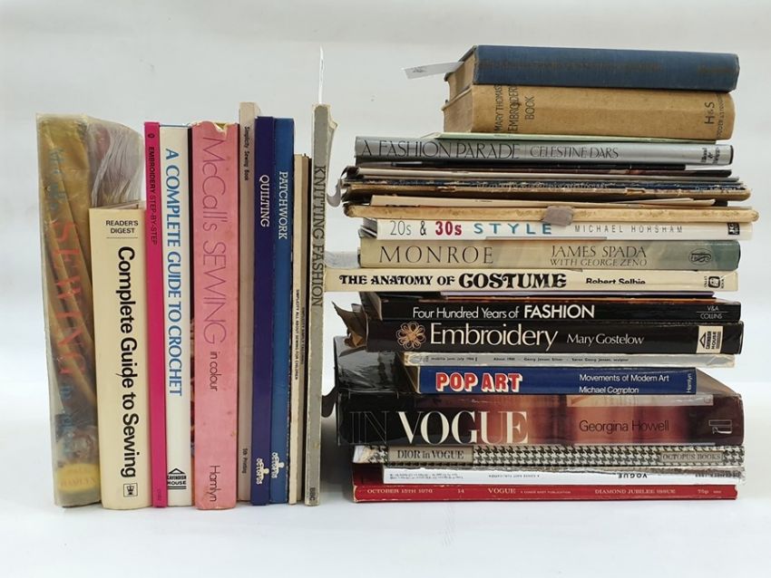 Collection of books on Fashion, Embroidery, Knitting, Shawls, etc and a  Winnie the Pooh poster