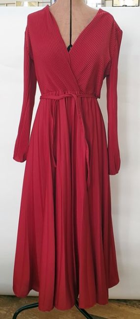 Six various crimpoline dresses including rust-coloured pleated bodice and skirt, a blue shirt dress with pleated skirt, a white shift dress, a blue pleated blouse, a navy blue and white mini coat dress and a red maxi dress (6)Condition ReportNo obvious faults to dresses.  Bright red dress is labelled 38'Majority of other items; as guide would be modern size 12.