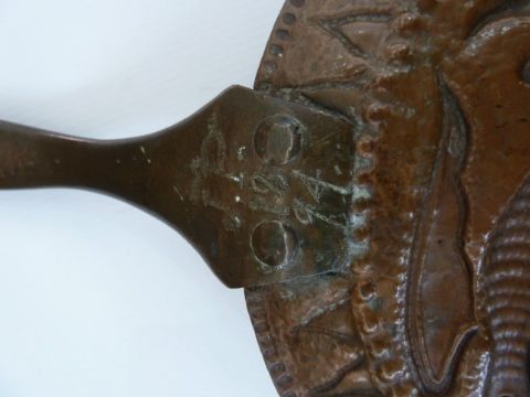 John Pearson, Newlyn school, copper chamber stick with plain tapered handle, circular base, with petal border, the centre with raised seabird decoration, initialled and dated 1894 to reverse, 20.5 cms diam and overall length 35 cms.