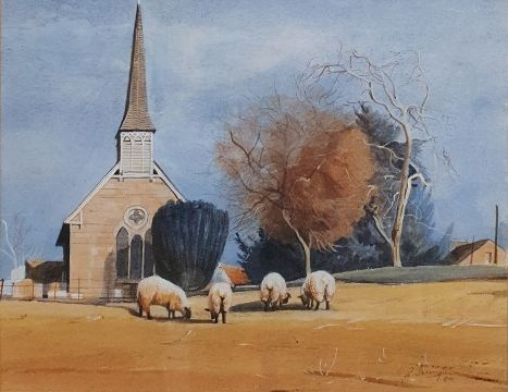 Brian SwindlerWatercolourStudy of four sheep with church in background, signed in pencil lower right, together with Sally BurnardPen, ink and watercolourThe Goose Girl, initialled lower right (2)