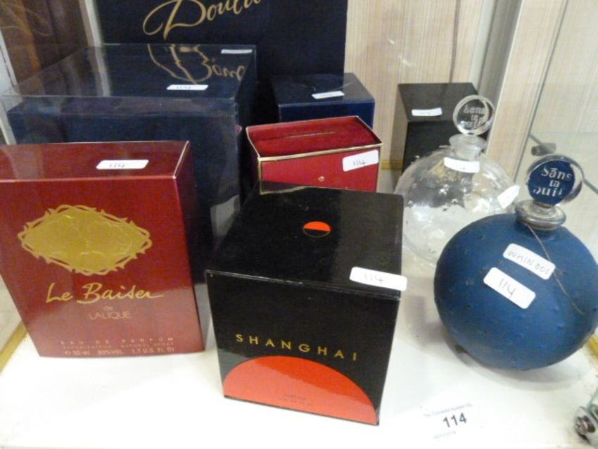 Assorted perfume bottles to include Rene Lalique Creation glass bottle, one Forsands La Nuit, La Baisen de Lalique bottle, Elizabeth Taylor diamonds and rubies, Elizabeth Taylor Black Pearls, etcCondition Reportthe Royal Doulton is unopened, Elizabeth Taylor Black Pearls unopend and 'Isadora' the rest are empty bottles