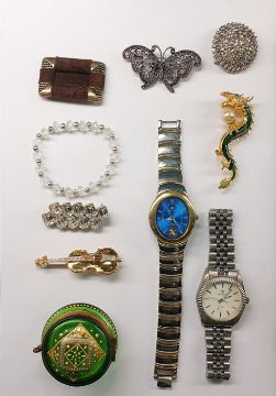 Assorted costume jewellery to include Dolce & Gabbana lady's watch, brooch in the form of a Chinese dragon, various further brooches, etc