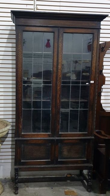 Early 20th century oak lead and glazed bookcase with cavetto moulded cornice above the two doors enclosing shelves, above two cupboard doors, on barleytwist supports and stretchered base, 204cm x 91cm