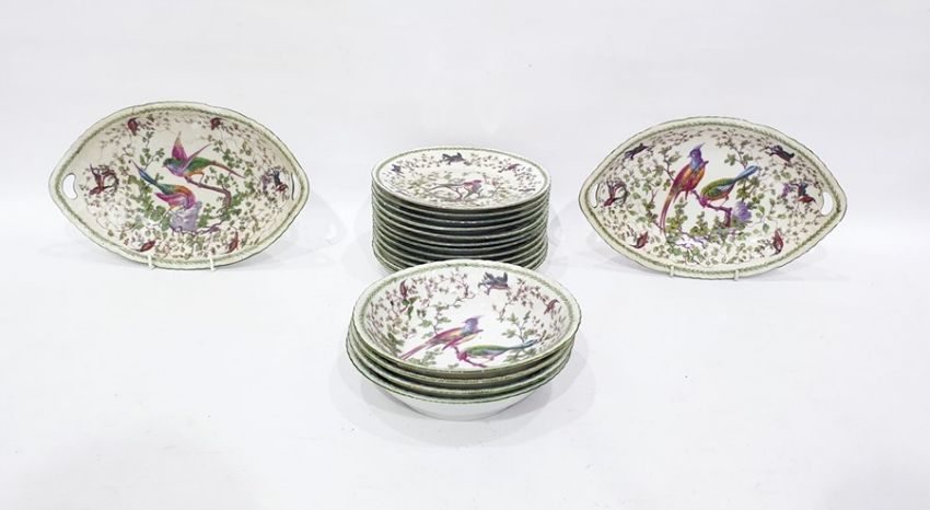 Continental porcelain dessert service decorated with pair Asiatic pheasants on flowering branches and other birds, viz:- pair boat-shaped serving dishes and a quantity of bowls and plates