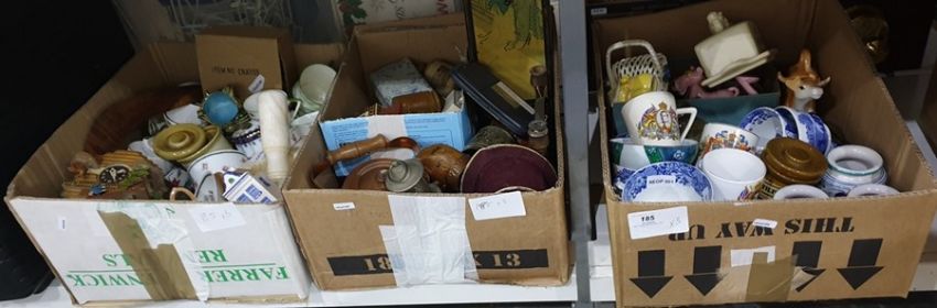 Quantity of ceramics including commemorative, blue and white, ornaments, cuckoo clock, collectables, etc (3 boxes)