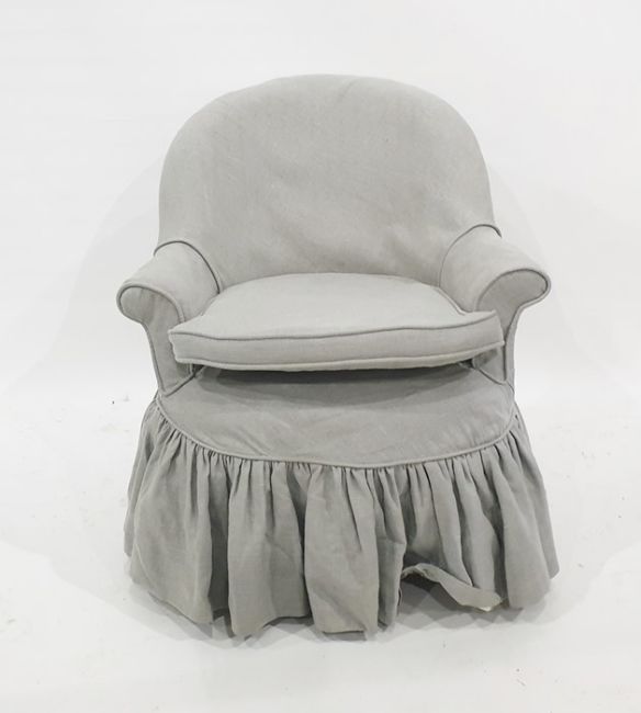 Victorian scoop-back easy armchair on ebonised turned stump supports, blue/grey linen loose cover