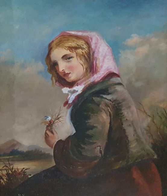 Continental 19th centuryOil on canvasHead and shoulders portrait of a young girl, wearing a pink scarf and jacket with fur cuffs,  holding a small bunch of flowers, mountainous background, initialled R S lower left, 27 x 22 cms approx.