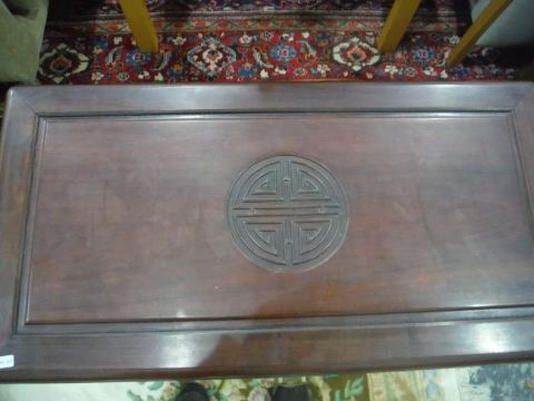 20th century Chinese camphorwood lined chest with carved shou symbol to the top and front, the whole raised on ogee bracket feet, 103cm x 60.5cm Condition ReportGenerally okay, some light scratches and knocks. See images.