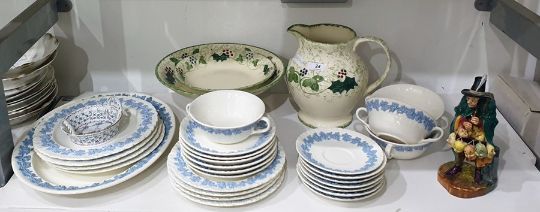 doulton figure, loss to pipe. dinnerware, crazing, some cracks, one plate reglued, some chips. General wear and tear all items.