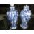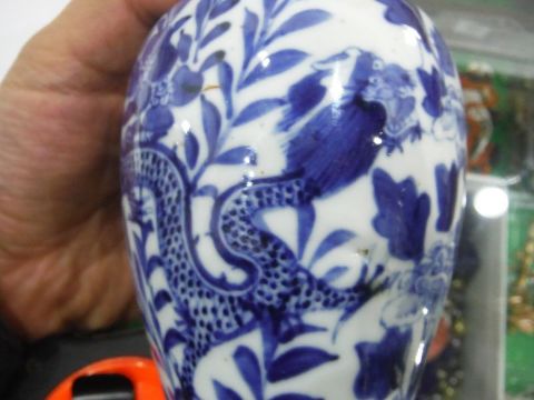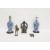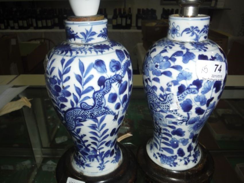 Two similar Chinese porcelain blue and white baluster vases mounted as lamps, four-character marks, each painted with scrolling dragons amongst flowering leafy branches, drilled to base, mounted on wooden stands and adapted for electricity, 27.5cm high max including fittings, three bronzes including a Tibetan-style Buddhistic figure seated on a cushion, on a square plinth base, the four-armed female figure modelled holding precious objects, 18cm high, a figure of a drummer and a plaque forrmed as a tribal figure, pierced for hanging (5)  Condition Reportchips to ceramic base on one lamp, discolouration on both, 18cms tall both drilled and converted. see images.