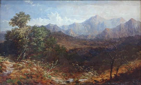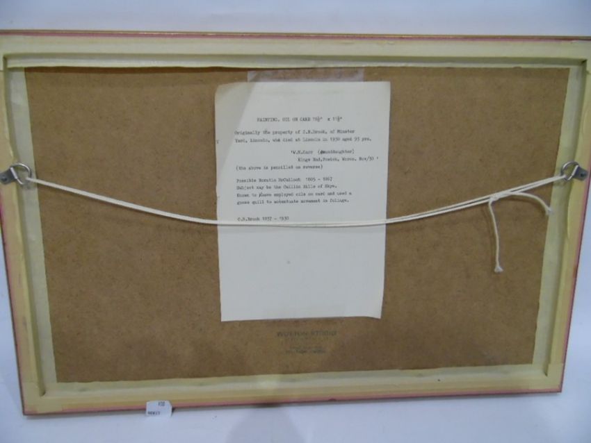 19th century EnglishOil on cardHoratio McCulloughPossibly view of Cuillin Hills, Skye, labelled verso with information  28 x 46 cmsCondition ReportPlease find images of the back of this picture