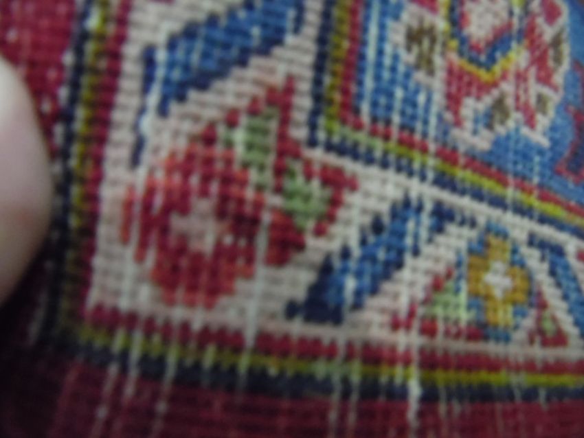 Red ground rug with stepped central foliate decorated medallion, the field with allover foliate decoration, stepped spandrels and three margin border, 384cm x 290cm Condition ReportFringes more or less gone, both ends. Uneven fading, mainly seen in the purple ground section of border, and purple ground spandrels and purple ground part of central medallion. Edges looking slightly threadbare in places. Some uneven wear. See images ofr further details. General wear and tear throughout.