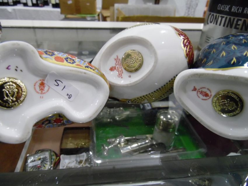 Royal Crown Derby china paperweight "Royal Cat" pattern and seven other Royal Crown Derby china paperweights to include model birds, duck, penguin, squirrel and a small clown (8) Condition ReportOwl ornament with large loss to back. No stopper in cat or clown. Remainder with gold stoppers, thrush looks to have a slightly more silver stopper, but it is difficult to tell.Condition of pieces except the owl, generally okay, some light scratches.