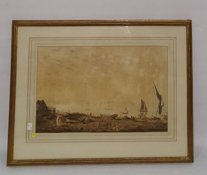 Early 19th century English  schoolWatercolour drawingEstuary scene with figures, boats and donkeys in the foreground, sepia toned , 30 x 47 cms