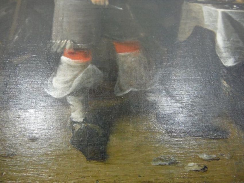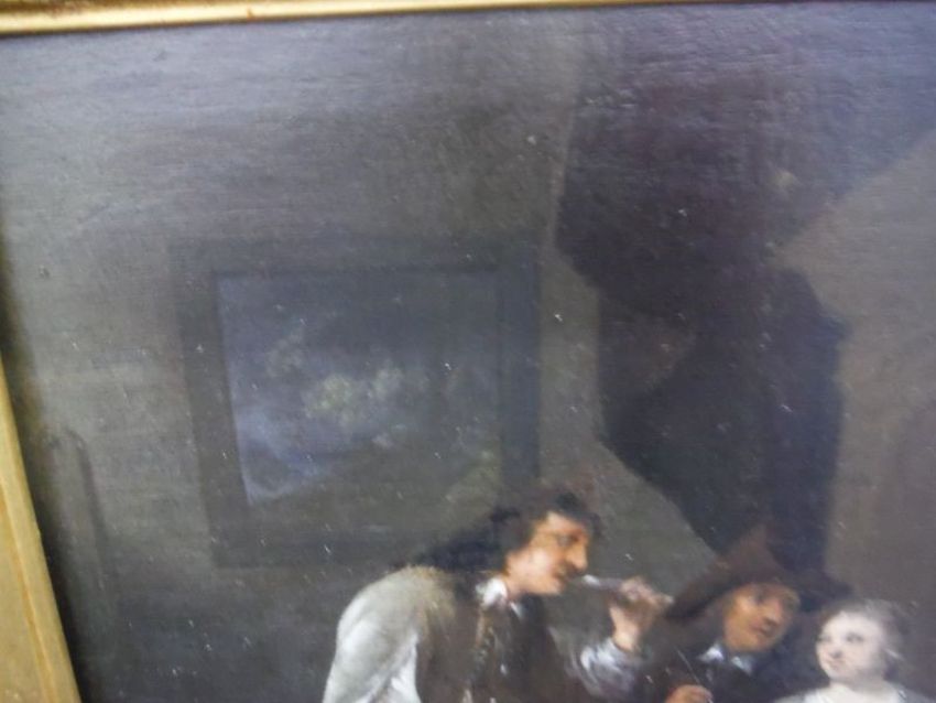 UnattributedOil on panelTavern scene with woman at table in conversation with two men , 26 x 19cmsCondition Reportappears very dark. some impressed marks and scratches. frame various cracks. general wear and tear throughout.