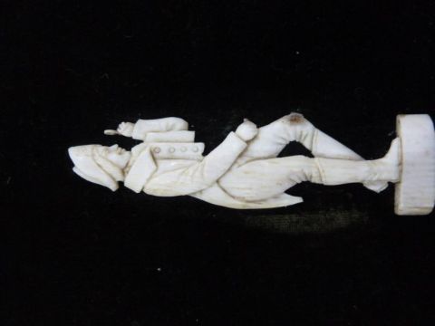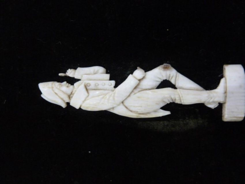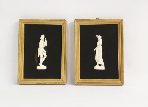 Ivory miniature figures on velvet, possibly French, lady and gentleman in nineteenth century dress, each figure 9.75cm high (the parasol of the woman has separated from the figure but is present) (2) Condition Reportimages attached