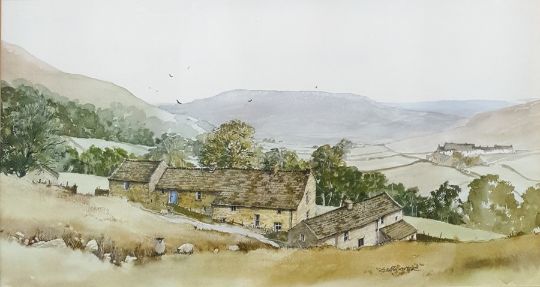 20th centuryWatercolour drawingRural scene, cottages nestling in mountainous scenery, label from Kingfisher Gallery to reverse 29 x 55 cmsWatercolour drawingIndistinctly signed, dated '92, Snowy scene with pond in foreground  23 x 68 cms (2)Together with (in addition to your printed catalogues) 12 volumes of The Handy-Volume Shakespeare published Bradbury, Agnew, & Co.