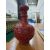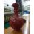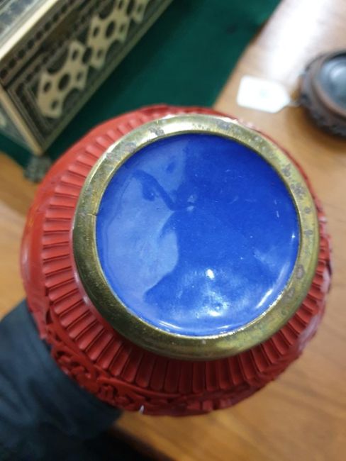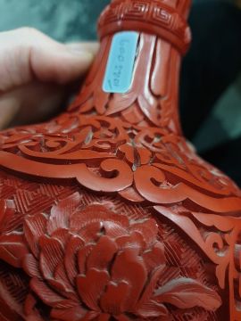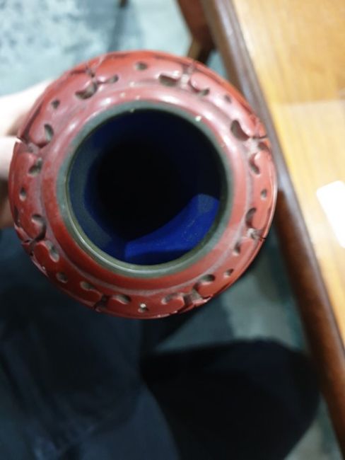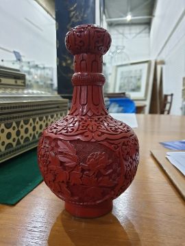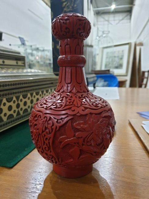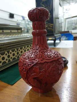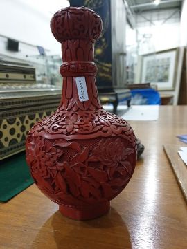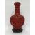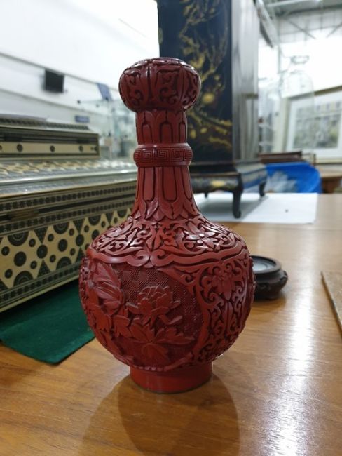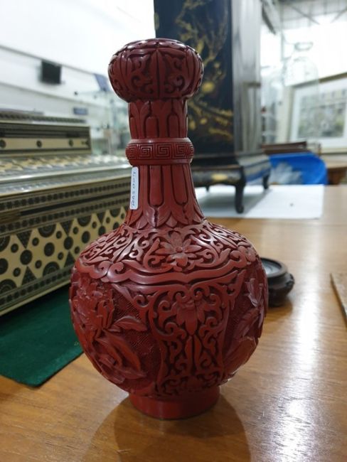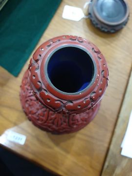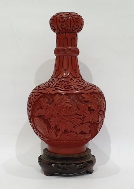 Chinese carved cinnabar lacquer vase, ball and shaft shaped with shaped panels of carved flowers on a ground of fretwork and flowerheads, 23cm high and the carved hardwood stand