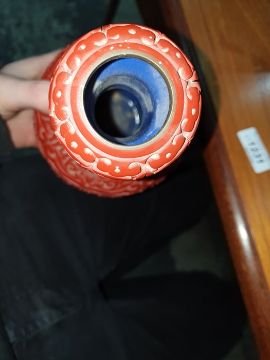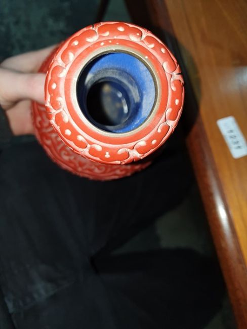 There are spots of white paint on the top as well as a couple of tiny chips to the pattern. The vase is 28 cm tall with the wooden stand and 23 cm without the stand. It is approx 13 cm wide at the middle and approx 6 cm wide at the top. See attached images.