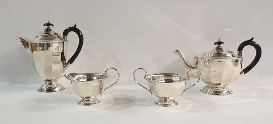 George V silver four-piece tea service to include teapot, hot water pot, cream jug and sugar basin, of octagonal panelled form, raised on circular bases, Sheffield 1930 by Viners Ltd, 37ozt