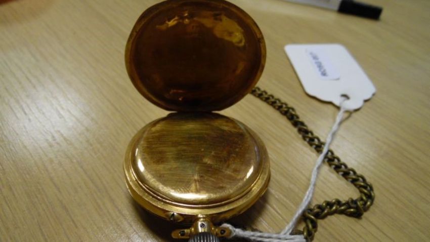 Gentleman's 18ct gold open faced pocket watch with white enamel dial, Roman numerals, subsidiary seconds dial, button winding and the metal Albert curb patternCondition ReportVarious cracks to the dial. Dents to the case. When wound, ticking is audible - this is no guarantee as to working condition. It is 18 ct marked.No inscriptiondings to the back,case diameter  45glass is replaced with plasticWe are unable to give gross weight of gold