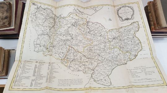 Hasted, Edward "The History and Topographical Survey of the County of Kent containing the Ancient and Present State of it, Civil and Ecclesiastical ...", illustrated with Maps and Views of Antiquities, Seats of the Nobility and Gentry, etc, Canterbury, printed for the author by Symonds and Kirkby in 1778, engraved vignette on title page, engraved header on dedication, 4 vols, folding maps, engraved plates, vignettes, etc, contemporary speckled leather re-backed, the backstrips of vols 2, 3 and 4 poor, vol 4 has suffered badly from damp and degradation, contents of 1, 2 and 3 clean and undamaged, folio (4) Not collated and bought as seenCondition ReportThere are nine maps in vol I, including Blackheath, ten maps in vols II, 13 in vol III, . volume IV is in very poor shape from damp, mice and lack of care!