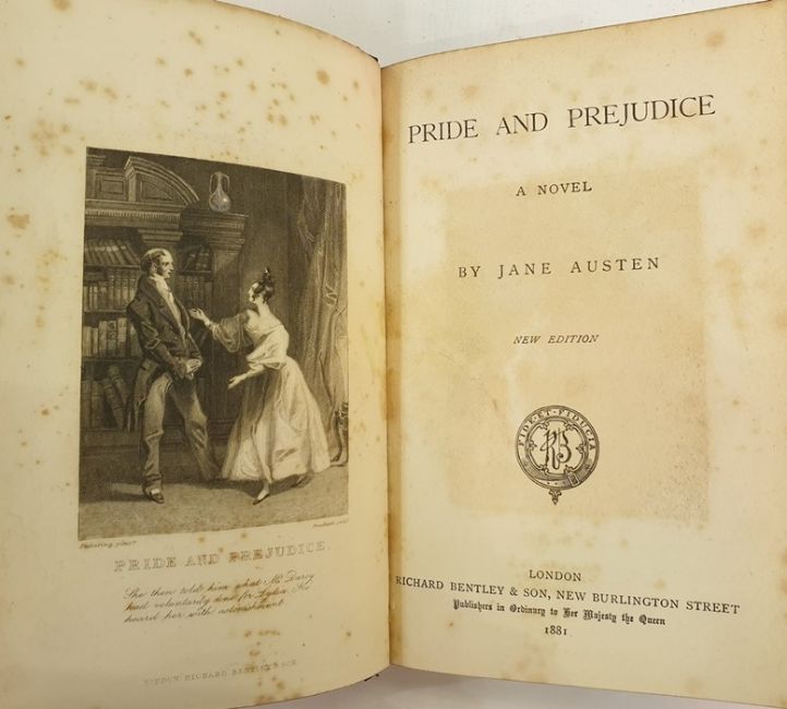 Jane Austen "Austen's Works including Pride and Prejudice, Mansfield Park, Emma, Sense and Sensibility, Northanger Abbey, Memoir of Lady Susan etc, Richard Bentley 1879, 1880, 1881, 1882, 1883", marbled endpapers, marbled boards, half morocco, pastedowns missing on all volumes, all marble edges, and another copy of Lady Susan (7)
