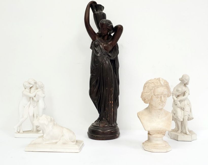 In the order as catalogued. Parianware figure is dusty, has one chip to base. Three graces are grubby but otherwise appear good. Beethoven bust is yellowed and has slight scratch to forehead. Grecian figure has some wear to the finish. Study of lion has two casting cracks in base and one paw is missing.