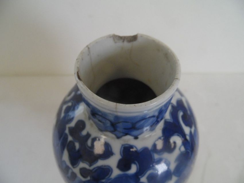 Chinese blue and white vase, Kangxi mark to base (chip to rim and cracks) Condition ReportThe vase is 26cm tall. There is damage to the base and rim. See additional photo's