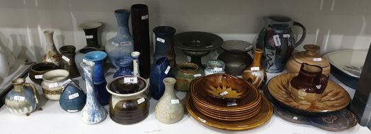 Collection of 20th century studio pottery to include jugs, vases etc., a Doulton Lambeth jug decorated with hunting scenes and various French pottery plates etc.