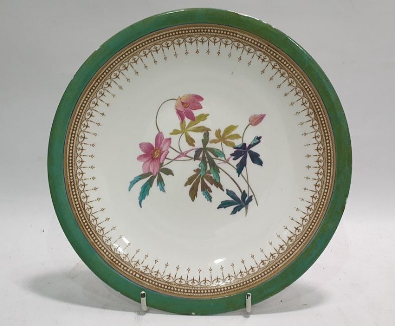 Set of nine Copeland dessert plates, each decorated with flower to central white ground field, gilt and green borders (9)