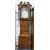 English long cased clock of broad proportions with brightly painted dial by Rutherford of Huddersfield, with subsidiary seconds dial and calendar dial, eight-day movement, the hood featuring swan-neck pediment and brass sconces, with turned columns, the door with an ivory escutcheon, the pedestal with an octagonal inlaid pattern