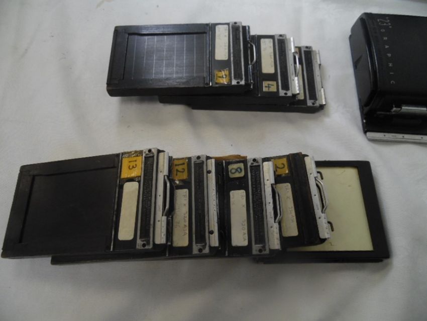 Interesting lot of old cameras, lenses, wooden-framed focusing screen, Ilford plates, etc, all in two leather cases Condition ReportPlease see extra photo's