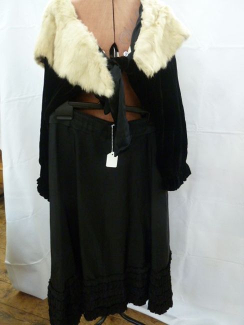 Victorian full circle black skirt, possibly once a petticoat with ruffled tape detail to the hem and a Victorian velvet jacket in black with white fur collar (2)
