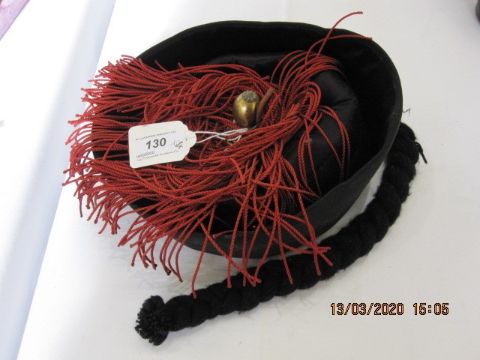 Chinese(?) black and navy silk hat with red tassel and gilt-metal pompom, possibly theatrical, a beadwork miser's purse and two other items (4) Condition ReportPlease see additional images