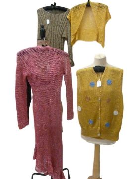 Pink knitted and silver thread early 1970's dress, Alexis de Fursac Paris sleeveless jumper in yellow and gold knit with appliqued circles in blue, brown and cream, the buttons being blue and yellow, small crocheted bolero in yellow and gold knit and long skinny rib silver lame knitted jumper with long sleeves and cuffs (4)