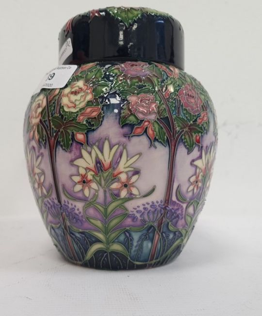 Moorcroft ginger jar decorated on a purple ground with white flowers and trees, marked to base '208//250', signed 'R J Bishop', 15.5 cm