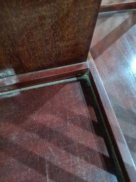One of slats is broken on the bottom as well as wear to to others. One of the wheels is loose, making the piece wobbly. One of the shelves in the middle is loose. Some of the branding on the top is loose and there are some marks to the top. See attached images.