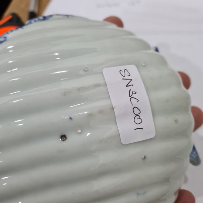 18th century Lowestoft-style porcelain pickle dish, scallopshell pattern and having underglaze blue decoration of peony, brocade and lappet border, 13.5cm wide Condition ReportThere are small chips to the top of the edge as well as wear. There are marks to the bottom. See attached images.