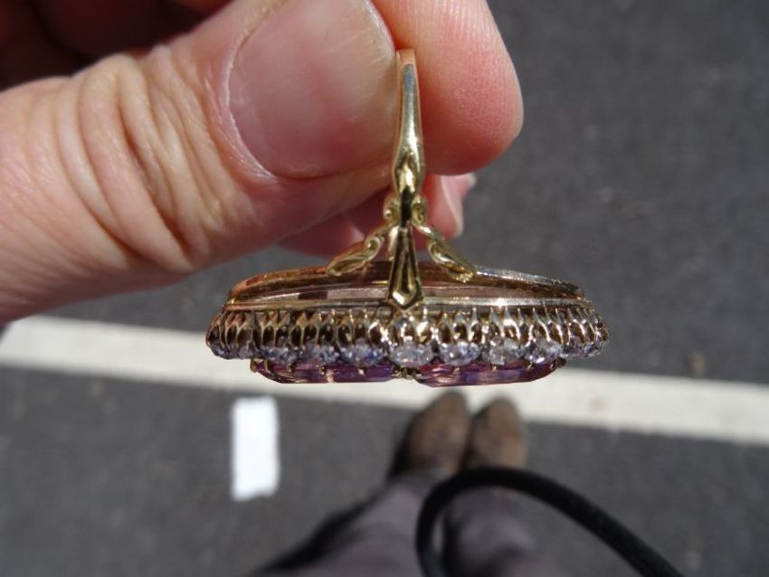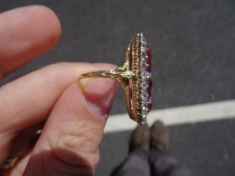 Gold-coloured pink stone, probably tourmaline, and diamond dress ring, of marquise form set with two pink facet-cut tourmalines in claw settings (each approx. 13 x 8mm), surrounded by 22 old-cut diamonds (estimated total diamond weight 3.25ct), with pierced gallery and shoulders, fingersize R ½, approx 9.2gCondition ReportNo obvious major faultsPlease note that weights of gemstones and grading information for diamonds are very much estimates and for guidance only.  Both coloured gemstones and diamonds are routinely treated to enhance their appearance.  We cannot guarantee that gemstones are free of treatments.