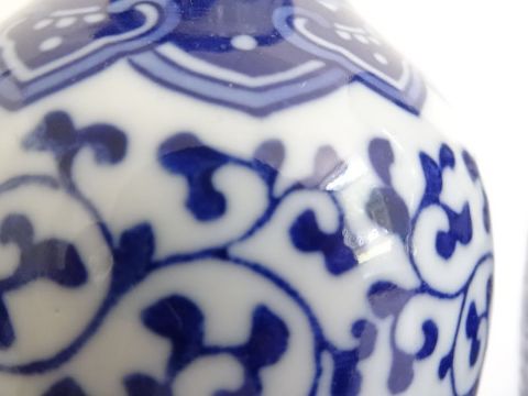Pair Chinese porcelain baluster vases with underglaze blue decoration of flowerheads, on a scrolling foliate ground, seal mark to base, 26cm high and another similar vase, shouldered ovoid, 26cm high (3)