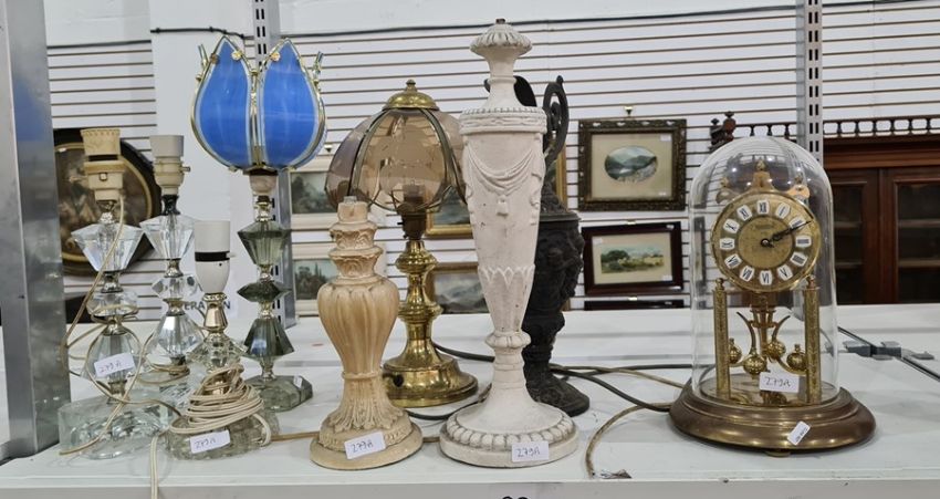 Quantity of lamps, modern clock and a ewer