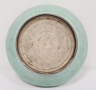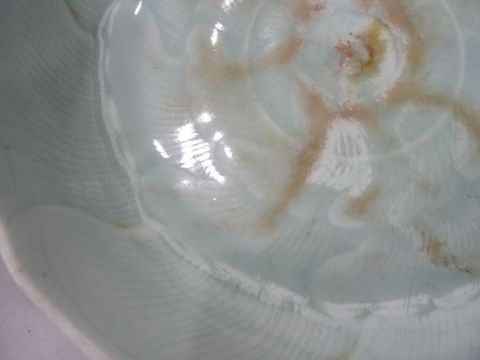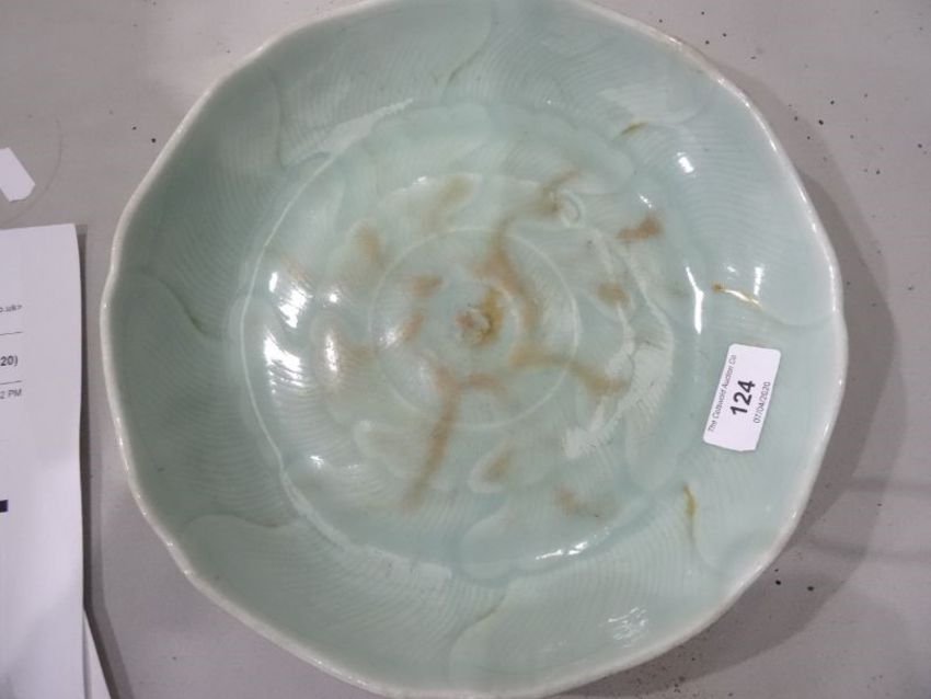 Chinese porcelain shallow dish, celadon glaze with incised waves, 23cm diameterCondition ReportVarious marks and scratches, knife marks, general wear and tear.
