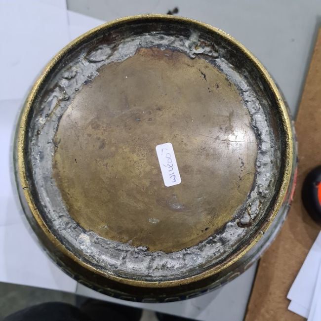 Chinese cloisonne and bronze jardiniere, ovoid with flared rim, having two cloisonne bands of lappets and scrolling flowers, 19.5cm high Condition ReportSome wear to the enamel in places, otherwise ok. See attached images