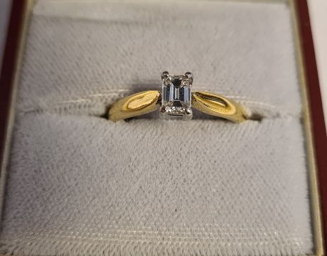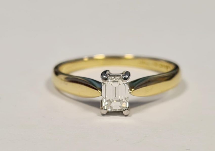 18ct yellow gold diamond solitaire ring, set with a emerald-cut diamond (estimated diamond weight 0.38ct, VVS2, colour G), fingersize P, approx 3gCondition ReportNo obvious major faults Please note that weights of gemstones and grading information for diamonds are very much estimates and for guidance only.  Both coloured gemstones and diamonds are routinely treated to enhance their appearance.  We cannot guarantee that gemstones are free of treatments.