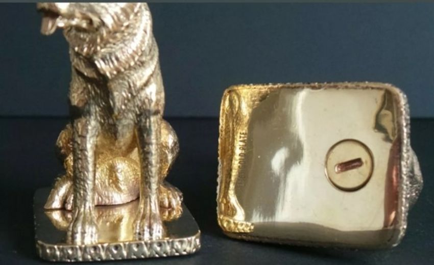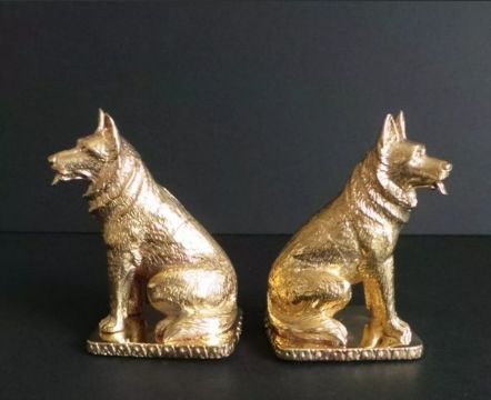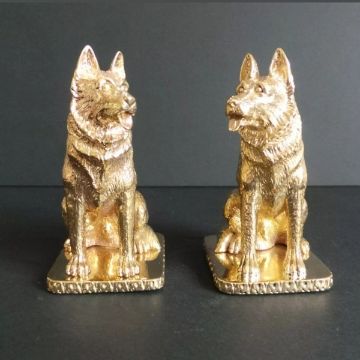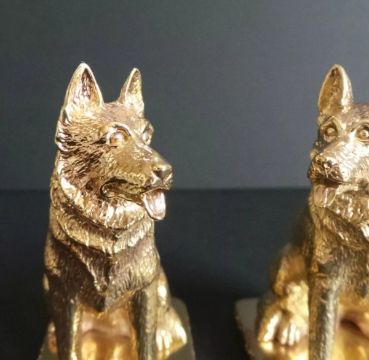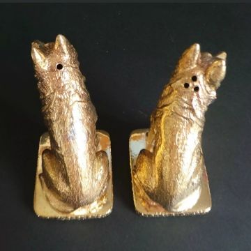 18ct gold-plated salt and pepper cruet set modelled in the form of German Shepherd dogs, marked '18ct gold plated' to base