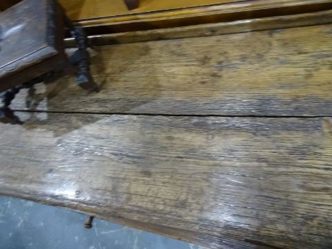 Possibly late 18th/early 19th century pine sideboard with two drawers, turned supports and a low stool (2) Condition Report181x70.5 cm. Cut down. Used to have a top. Large crack with some filler. Very work all over, uneven, warped. Some word worm holes. Probably with alterations and newer parts. General wear and tear throughout.