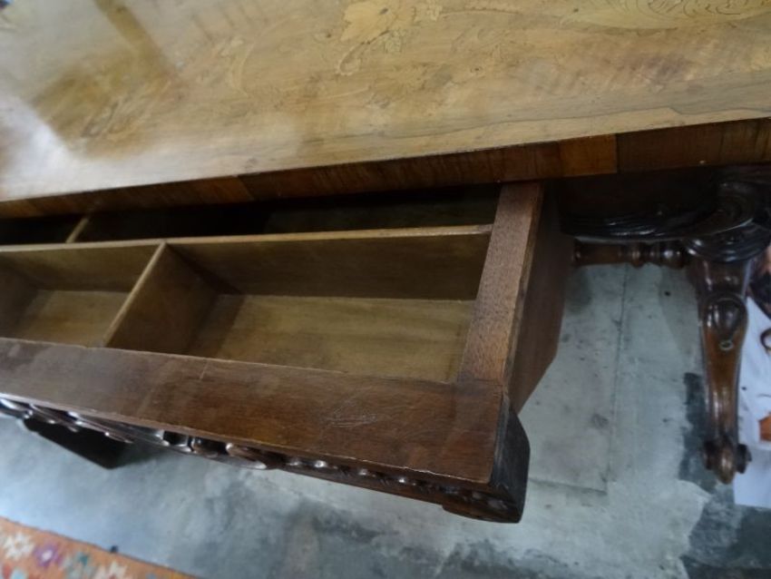 19th century and later single drawer side table, the continental rectangular top with chamfered corners, marquetry inlaid with floral sprays, butterflies, birds, acanthus leaf and rosewood banded on a Victorian English-style mahogany base with acanthus leaf moulding, turned end and carved pedestal supports to cabriole legs united by turned and carved stretcher, 135cm x 73cm Condition Reportobviously a marriage. marks, impressed marks, top faded, old worm holes. general wear and tear.